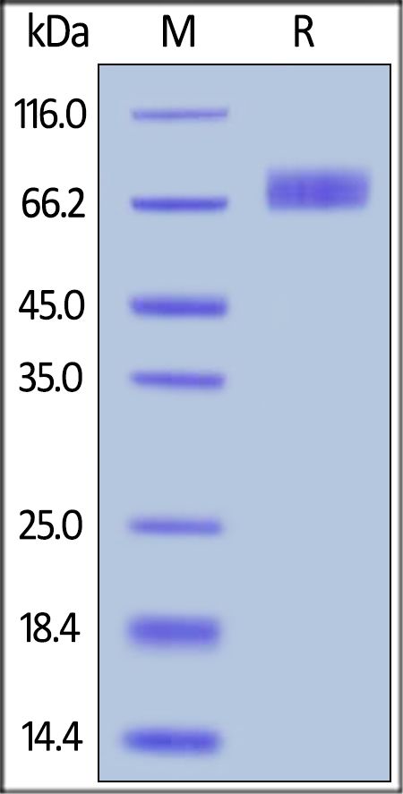 This protein carries a polyhistidine tag at the C-terminus. The protein has a calculated MW of 48.5 kDa. The protein migrates as 65-80 kDa under reducing (R) condition (SDS-PAGE) due to glycosylation.