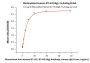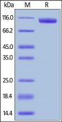 This protein carries a human IgG1 Fc tag at the C-terminus, followed by a Avi tag (Avitag). The protein has a calculated MW of 74.9 kDa. The protein migrates as 90-115 kDa under reducing (R) condition (SDS-PAGE) due to glycosylation.