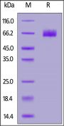 This protein carries a polyhistidine tag at the C-terminus. The protein has a calculated MW of 48.5 kDa. The protein migrates as 60-70 kDa under reducing (R) condition (SDS-PAGE) due to glycosylation.