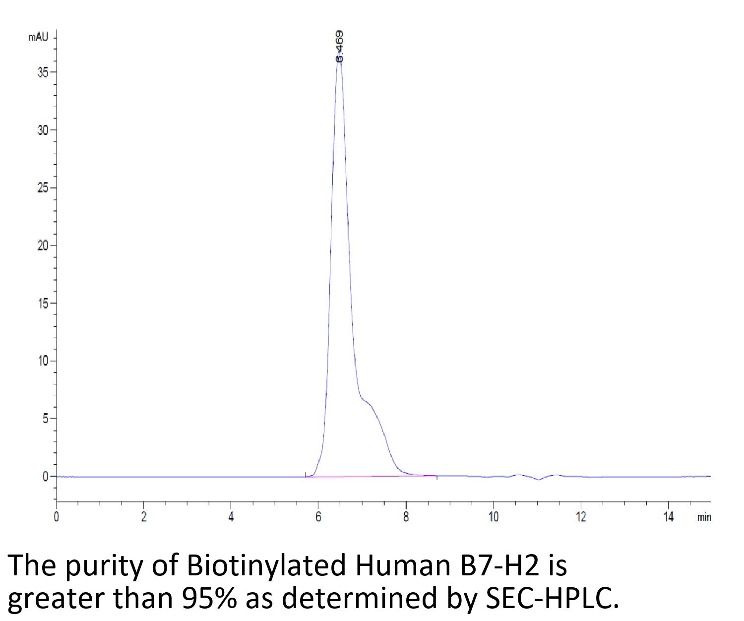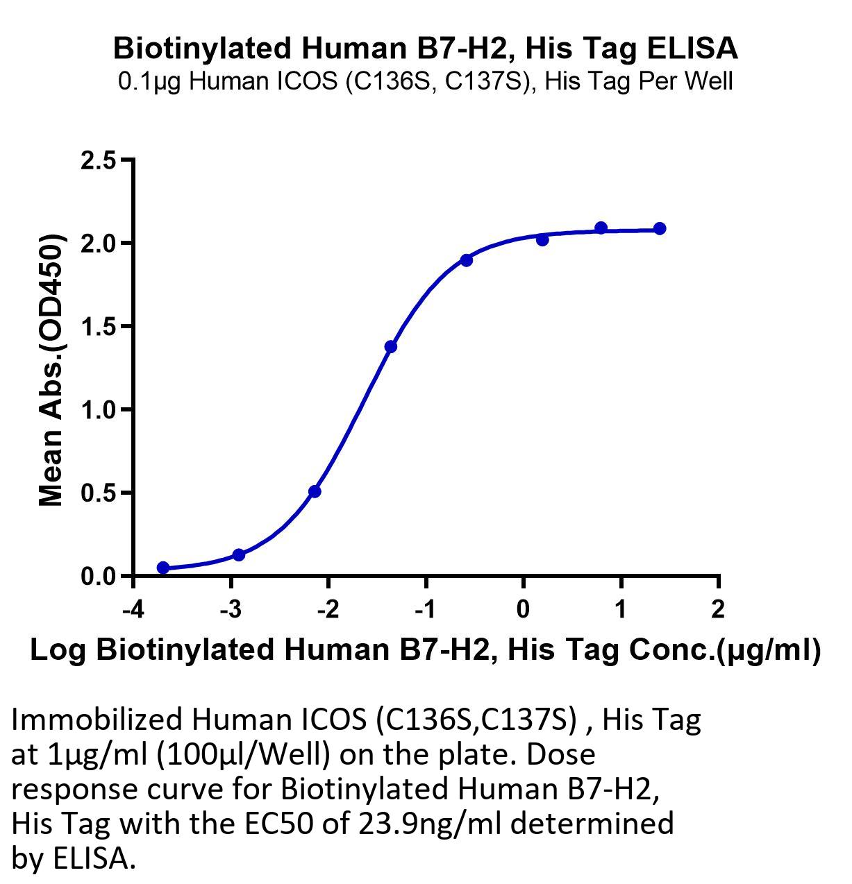 Recombinant Biotinylated Human B7-H2/ICOSLG Protein is expressed from HEK293 with His tag and Avi tag at the C-Terminus.It contains Asp19-Ser258.