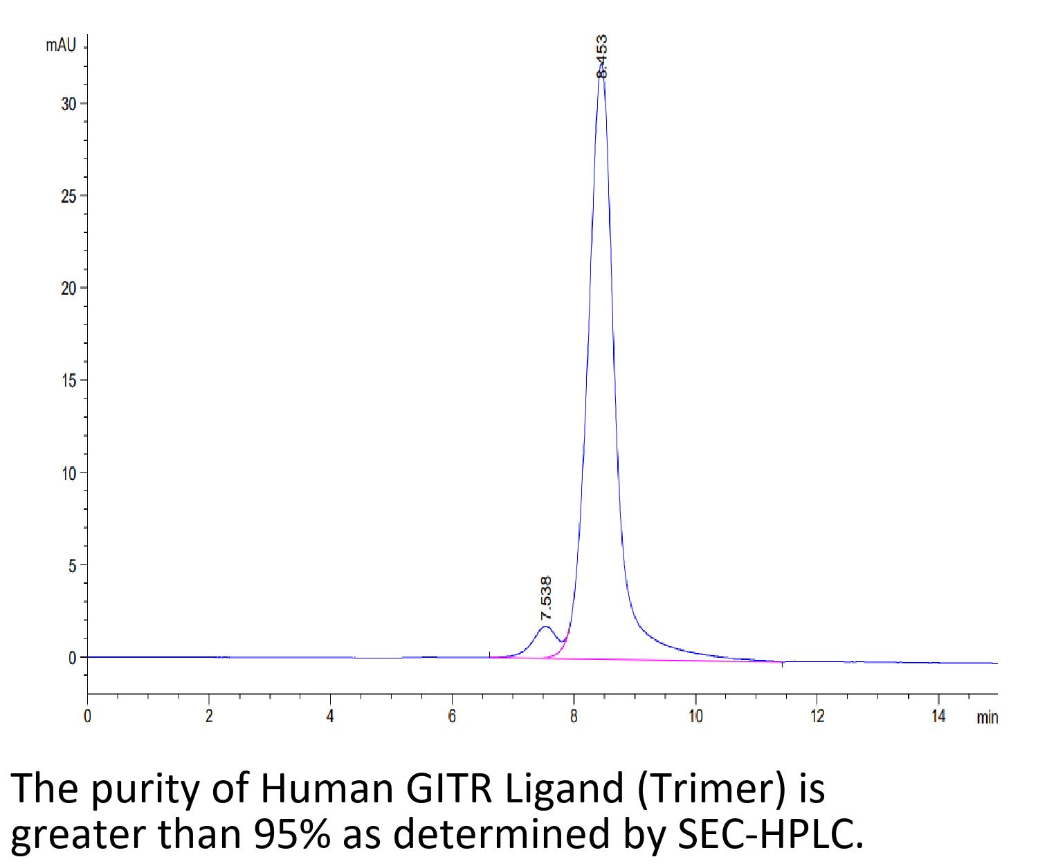Recombinant Human GITR Ligand/TNFSF18 Trimer Protein is expressed from HEK293 with monomeric hFc tag at the N-Terminus.It contains Gln50-Ser177.