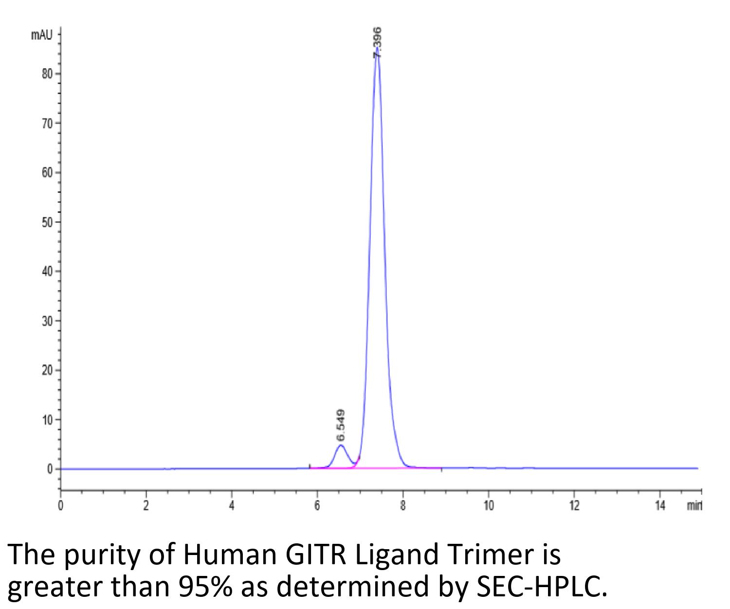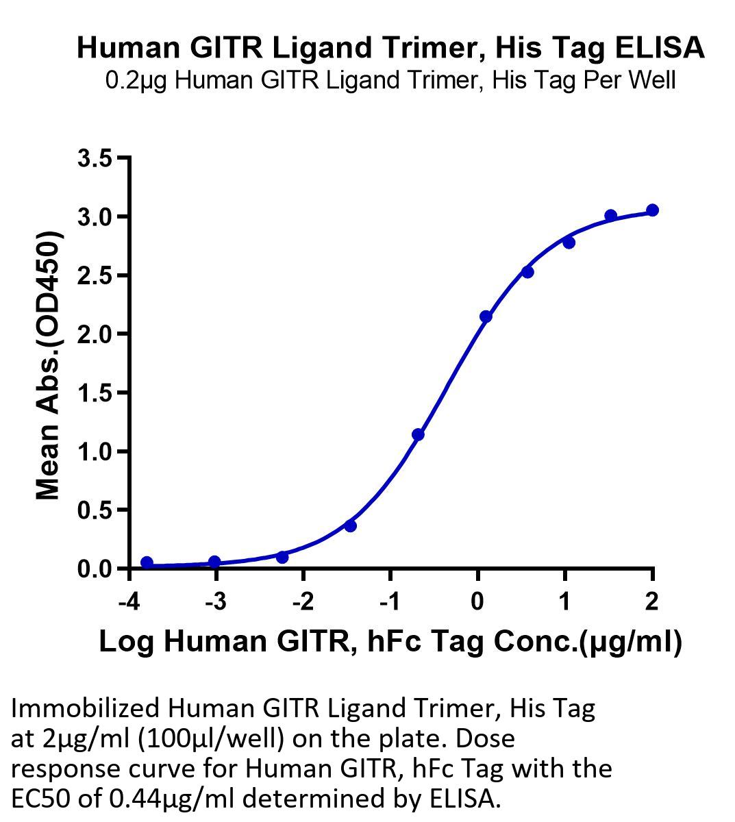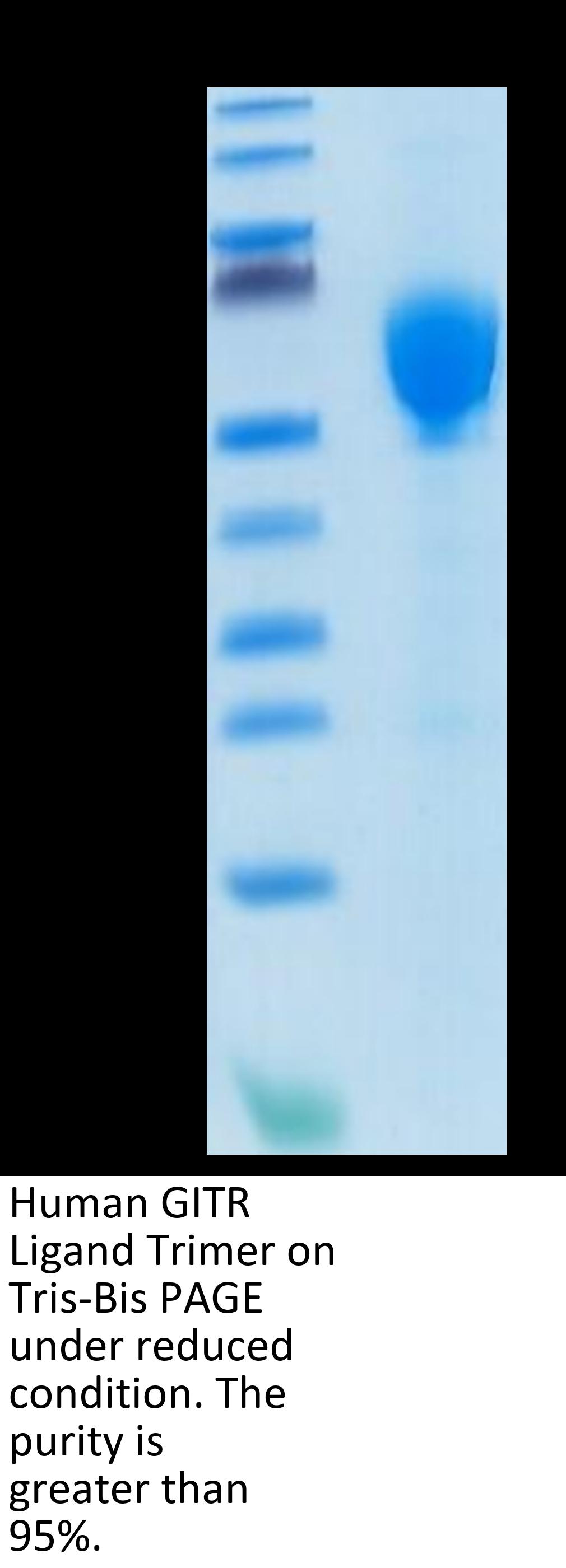 Recombinant Human GITR Ligand/TNFSF18 Trimer Protein is expressed from HEK293 with His tag and flag tag at the N-Terminus.It contains Gln50-Ser177.