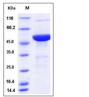 The recombinant mouse S100A7A/MBP fusion protein consists of 505 amino acids and has a calculated molecular mass of 56.5 kDa. It migrates as an approximately 50 kDa band in SDS-PAGE under reducing conditions.