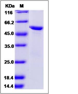 The recombinant HIV-2 gp36 consists of 524 amino acids and has a predicted molecular mass of 58.8 kDa. The apparent molecular mass of the recombinant protein is approximately 55 KDa in SDS-PAGE under reducing conditions.