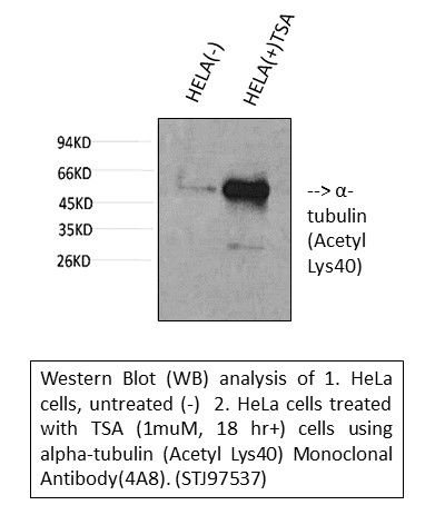 Tubulin alpha is a protein encoded by the TUBA1A gene which is approximately 50, 1 kDa. Tubulin alpha is localised to the cytoplasm. It is involved in the regulation of PLK1 activity at G2/M transition, development Slit-Robo signalling, the mitotic cell cycle and chaperonin-mediated protein folding. This protein falls under the tubulin family. Tubulin is the major constituent of microtubules which perform essential and diverse functions within the eukaryotic cytoskeleton. It binds two moles of GTP, one at an exchangeable site on the beta chain and one at a non-exchangeable site on the alpha chain. Tubulin alpha is expressed at high levels in the foetal brain. Mutations in the TUBA1A gene may result in lissencephaly. STJ97537 was developed from clone 4A8 and was affinity-purified from mouse ascites by affinity-chromatography using specific immunogen. This antibody detects endogenous tubulin alpha proteins.