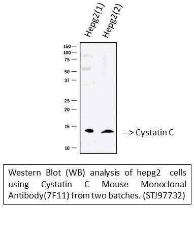 Cystatin C is a protein encoded by the CST3 gene which is approximately 15, 7 kDa. Cystatin C is secreted into the extracellular space. It is involved in the innate immune system, salivary secretion, neuroscience and plaque formation. This protein falls under the cystatin superfamily. It is the most abundant extracellular inhibitor of cysteine proteases and is thought to serve an important physiological role as a local regulator of this enzyme activity. Cystatin C is expressed in the nervous system, blood, kidney, saliva and muscle. Mutations in the CST3 gene may result in Creutzfeldt-Jakob disease. STJ97732 was developed from clone 7F11 and was affinity-purified from mouse ascites by affinity-chromatography using specific immunogen. This primary antibody detects endogenous levels of CST3.