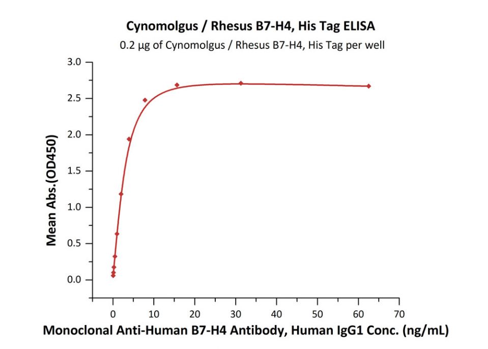 Immobilized Cynomolgus / Rhesus B7-H4, His Tag (Cat. No. B74-C52H9) at 2 μg/mL (100 μL/well) can bind Monoclonal Anti-Human B7-H4 Antibody, Human IgG1 with a linear range of 0.1-8 ng/mL (QC tested).