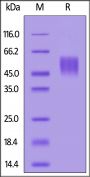 This protein carries a polyhistidine tag at the C-terminus. The protein has a calculated MW of 27.2 kDa. The protein migrates as 45-60 kDa under reducing (R) condition (SDS-PAGE) due to glycosylation.