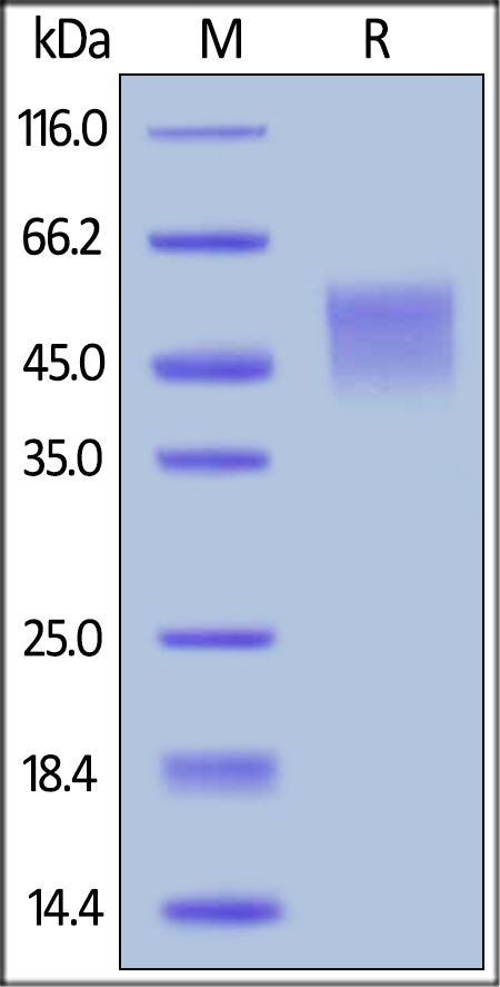 This protein carries a polyhistidine tag at the C-terminus. The protein has a calculated MW of 26.4 kDa. The protein migrates as 43-60 kDa under reducing (R) condition (SDS-PAGE) due to glycosylation.